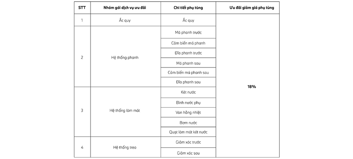 Phụ tùng được ưu đãi thuộc các hệ thống: hệ thống phanh, hệ thống treo, hệ thống làm mát, bình ắc quy và cao su chân máy. Chi tiết các hạng mục ưu đãi: